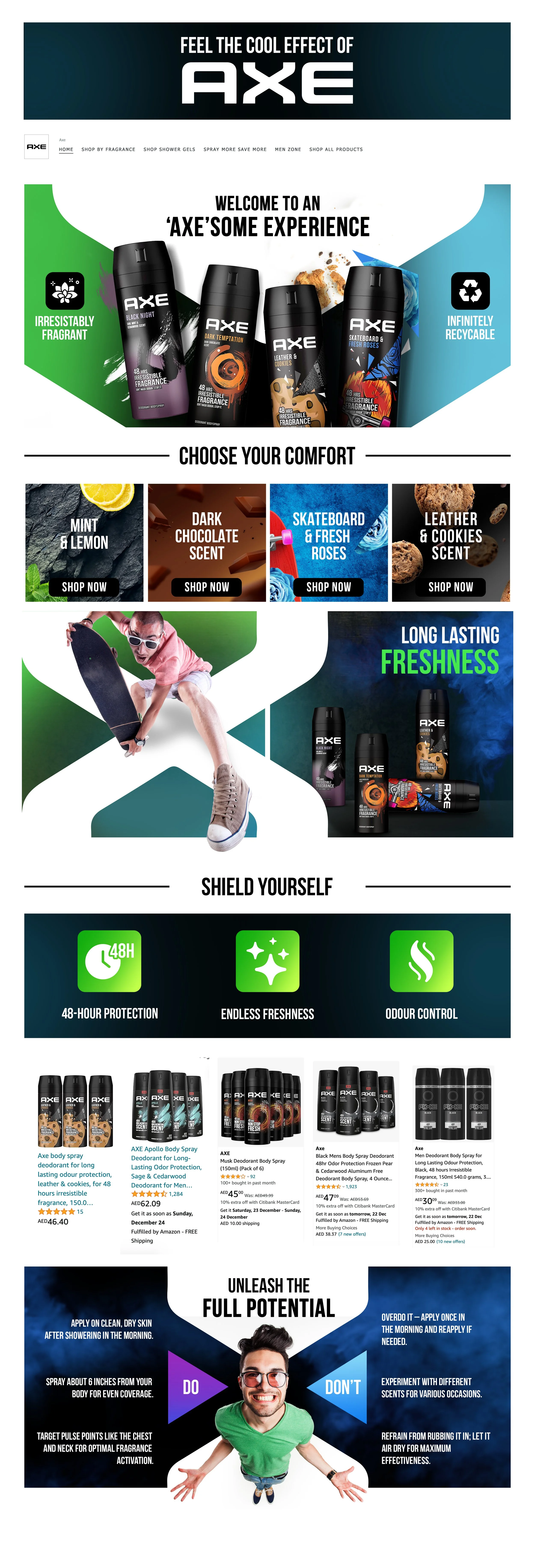 We crafted a visually engaging brand store for Axe on Amazon, leveraging negative space to reduce visual clutter, highlighting hero products, and creating a clean visual hierarchy that naturally directs attention and increases conversion.