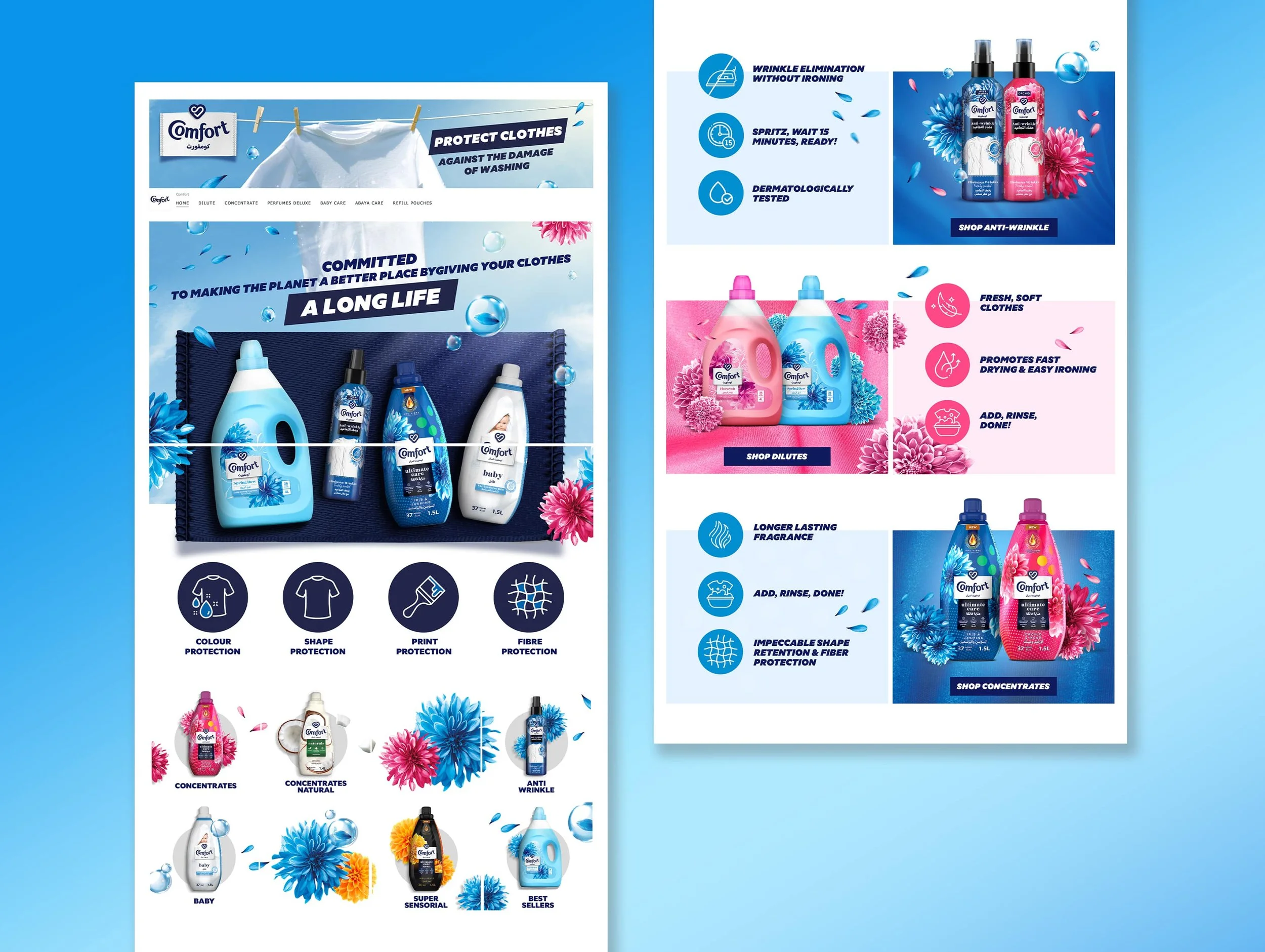 We worked on a visually engaging brand store for Comfort (by Unilever) on Amazon, translating the brand’s essence into a clean, sensory-driven digital experience that emphasizes softness, fragrance, and fabric protection while guiding users through a seamless shopping journey.
